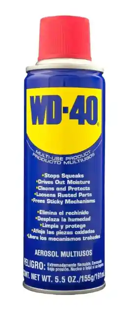 Lubricante multiuso WD-40 ideal para aflojar piezas, eliminar óxido, proteger contra la humedad y lubricar mecanismos.