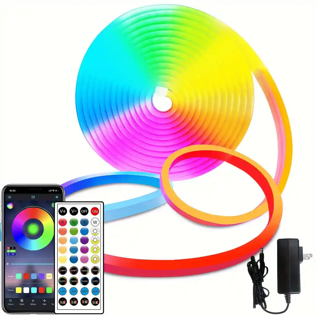 Decoración de iluminación: las luces LED de neón tienen 16 millones de colores, 20 modos dinámicos, sincronización de música, modo de película, selección de color inteligente, cambio de temperatura de color. Rango de lanzamiento de 120 grados, proporciona una cobertura de iluminación de gran área con luz muy uniforme. Flexible e impermeable: en comparación con las tiras de luces LED ordinarias, esta cuerda de luz LED es más flexible, el material suave se puede moldear o doblar en cualquier ángulo, y se puede instalar de forma flexible en cualquier lugar que desees. Clasificación de impermeabilidad IP65