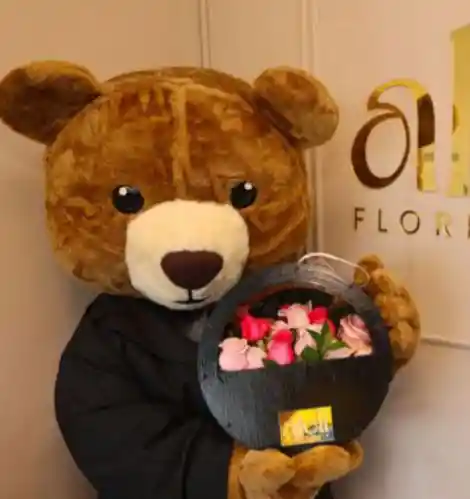 Rosas en tonos rosados en base circular negra con diseño de media luna.