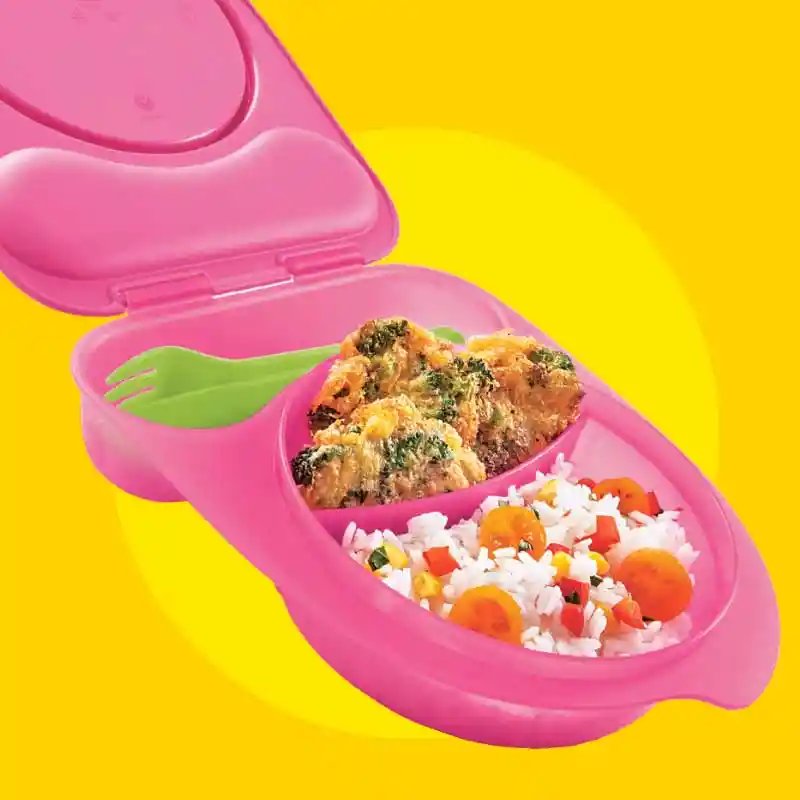 Es perfecto para transportar pequeñas porciones. No apto para Microondas. Cuenta con 2 (dos) divisiones internas para transportar 2 tipos diferentes de alimentos. Gracias a su práctica pestaña podrás abrirlo con facilidad. Incluye un tenedor y una cuchara pequeños. Dimensiones: 17.5 x 21.8 x 4.5 cm de alto c/u Cap.:160 ml /240 ml (400 ml). Dile No a los plásticos de un solo uso., Producto Libre de BPA. El color de los cubiertos puede cambiar.