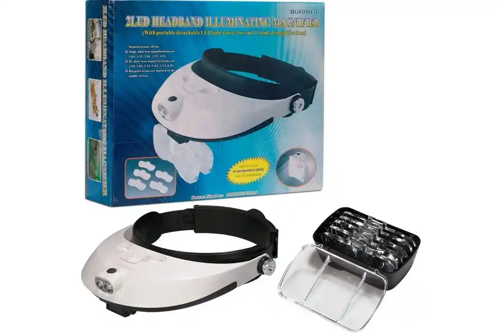 Lupa Led con visera 5 lentes Ideal para personas que trabajan con piezas muy pequeñas o necesitan tener detalle de algo y a la vez tener libertad de movimiento con las manos. Ideal para joyeros, coleccionistas, filatelia, relojeros, veterinarios, costureros, entre otros .Características• Material: Plástico ABS y en lentes Policarbonato de alta calidad.• Tamaño Aprox.: Banda cabeza: 25.5 x 20 x 4.5 cm• Lentes: 4.6 cm x 10.2 cm x 6 mm• Caja: 7 x 23 x 22.8 cm• Peso Aprox.: Caja 618 g.• Banda Cabeza: 168 g.• De gran uso para reparación de relojes, valoración de joyería, grabado miniatura, reparación de electrodomésticos, entre muchos más usos.• Lentes con caja protectora y portátil.• La banda para la cabeza posee luz LED para que la visibilidad sea aún mejor, además de contar con sistema ajustable para la cabeza.• Usando la superposición de 2 lentes crea más aumento.• Aumentos de lentes y distancia a objetos vistos:• 1.0 x - 300~350 mm.• 1.5 x - 240~260 mm.• 2.0 x - 215~235 mm.• 2.5 x - 205~225 mm.• 3.5 x - 135~145 mm. Contenido:• 1 Lupa para cabeza con luz LED incorporada.• 5 Lentes Magnificadores: 1.0X / 1.5X / 2.0X / 2.5X / 3.5X.• 1 Caja protectora para lentes.• 1 Manual de usuario.• 3 Pilas AAA.