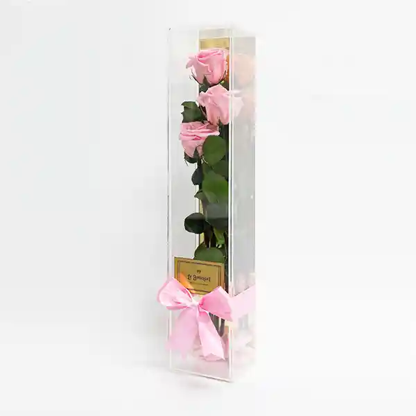 Elegante y moderna caja de acrílico con 3 rosas preservadas. Las rosas rosadas son ternura, cariño y feminidad. Las rosas no necesita agua y no se debe exponer a los rayos del sol directos ni a altas temperaturas de humedad.