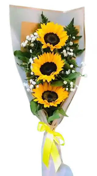 Un bouquet vertical de girasoles radiantes con delicados detalles blancos, ideal para regalar energía, optimismo y buena vibra. Flores frescas de calidad premium, seleccionadas y armadas profesionalmente para un diseño estilizado y moderno. Algunas flores pueden variar según la disponibilidad de temporada, manteniendo siempre la estética y el valor del arreglo. Incluye tarjeta personalizada sin costo adicional.