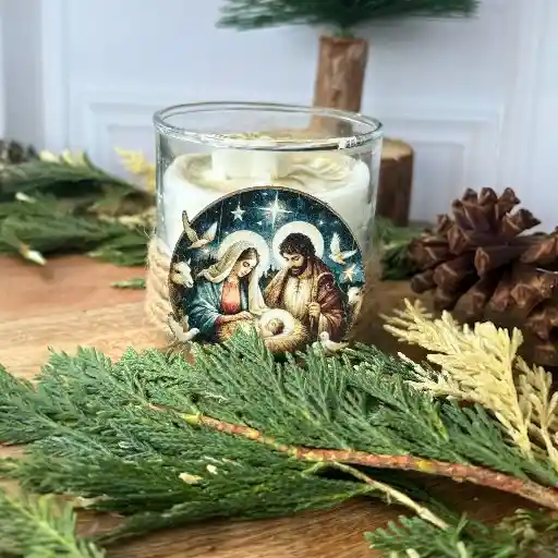 ELABORADA EN CERA VEGETAL Y PRESENTADA EN UN FRASCO DE VIDRIO . DECORADO CON APLICACION DE MADERA DE NACIMIENTO. EMPCADA EN CAJA