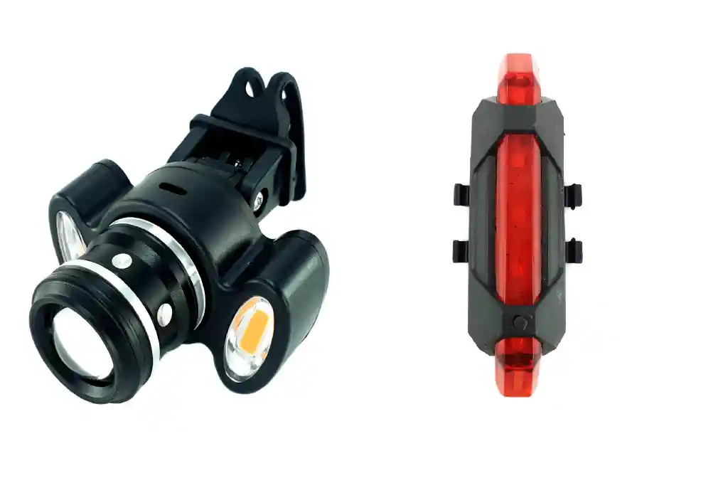 LUZ LINTERNA BICICLETA DELANTERA ZOOM 1000LM INDICADORAS + LUZ TRASERA LUZ DELANTERA Luz delantera que cuenta con un LED T6 de alta potencia, que cuenta con 3 modos de iluminación y luces indicadoras en color rojo la cual te hace mas visible, las luces indicadoras se pueden utilizar solas o con la linterna. - Es resistente a la lluvia pero no sumergible en el agua. - Adecuada para toda bicicleta, alta visibilidad en la noche. - La cabeza es rotativa lo cual permite ajustar el tamaño y distancia del chorro de luz al girarla. ESPECIFICACIONES TÉCNICAS: - Botón de encendido es sensible al toque, por si utiliza guantes. - El encendido y apagado es Cambiar entre modos de iluminación. - Potencia lumínica: 1000 Lúmenes. - Tipo de Foco: LED T6 - Capacidad de Batería Litio: 1200mah - Tiempo de carga 2,5 horas máximo. - Modos de iluminación: Linterna sola, Luces indicadoras solas, Linterna y indicadoras al tiempo. - Material : Plástico ABS y Aluminio. LUZ TRASERA Luz LED de seguridad para bicicletas, bicolor roja-azul modos intermitentes, Recargarble rápido se carga desde su ordenador o cualquier dispositivo con puerto USB. Adecuada para toda bicicleta,uso nocturno alta visibilidad en la noche. Instalación fácil, lo puedes hacer sin necesidad de herramientas. ESPECIFICACIONES TÉCNICAS: - 5 LED medida de 7 cm de largo - Adecuado para varios grosores del tubo de asiento 1,2 - 3,2 cm - Tiempo de carga 2 horas EL EMPAQUE INCLUYE LOS SIGUIENTES ARTÍCULOS: - Luz Led T6 Zoom - Cable USB a Micro USB para cargar. - 1 Luz trasera led