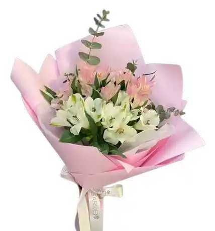 Bouquet floral en tonos blancos y rosados suaves, diseñado con flores frescas de alta calidad y un acabado moderno y sofisticado. Algunas flores pueden variar sutilmente según la temporada, manteniendo siempre el estilo, la armonía y el valor del arreglo. Incluye tarjeta personalizada sin costo para acompañar tu mensaje especial.