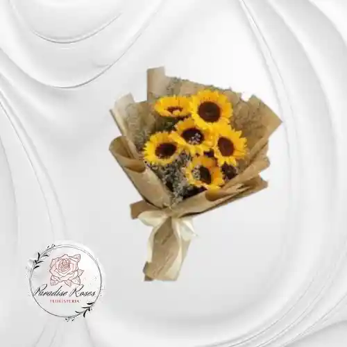 Encantador bouquet de girasoles naturales envueltos en papel rústico que resalta su belleza natural. Ideal para ocasiones como: Cumpleaños, Regalos de amistad, Felicitaciones, Agradecimientos.