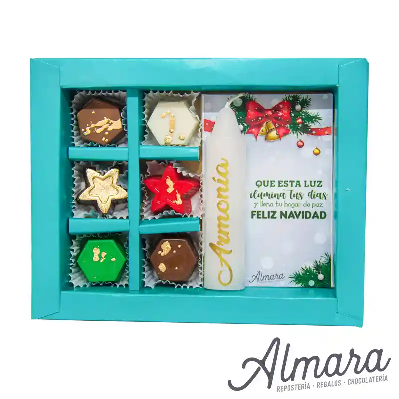 Caja de chocolates inspirada en la luz de la navidad Contiene 6 Bombones de chocolates rellenos 1 Vela con palabras inpiradoras y buenos deseos de navidad Caja de cartón medidas 10,5*14*3cm
