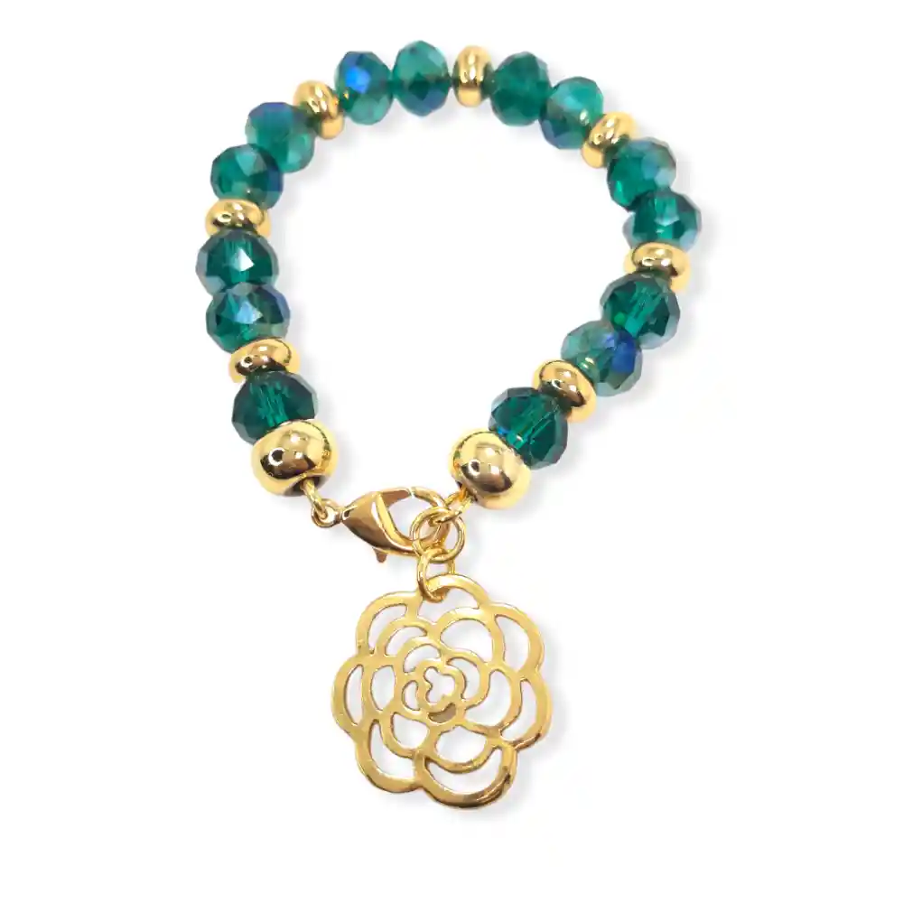 Así como únicas, cada pulsera cuenta una historia llena de sentimientos y buenos recuerdos. Dale un toque diferente a tu outfit para que la magia de nuestras pulseras perdure todo el día, pues las hemos creado llenas de significado y amor para inspirar y empoderar. Producto distribuido por Paralelos Accesorios Tipo de pulsera: Rígida con broche Materiales -Gemas: Vidrio color verde -Dije: Aleación con baño en oro brillante -Elementos metálicos: bronce con baño en oro 18k Tamaño aproximado: 17 cm de largo - 6.5 cm de diámetro Peso: 35 gramos - Garantía de 30 días en acabados bajo condiciones normales de uso. Cada pulsera integra diferentes elementos y materiales que merecen un cuidado especial. - Al ser una pieza ensamblada de forma artesanal el producto entregado puede presentar diferencias de colores y acabados al expuesto en la fotografía
