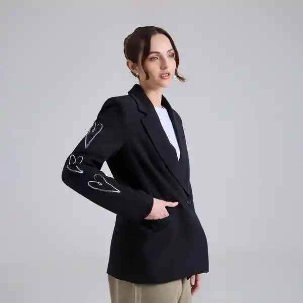 Blazer bordado negro de cuello y solapa clásicos, con manga larga y bolsillos delanteros de ribete con tapa. Cierre frontal con botón. El arte bordado en las mangas es elaborado manualmente por mujeres artesanas cabeza de familia, lo que convierte cada prenda en una pieza única. Composición: Cuerpo: 97% poliéster, 3% spandex. Forro: 100% poliéster. La modelo mide 1,70 m y usa talla XS. Cuidados especiales: Leer la etiqueta de cuidados antes de lavar. .