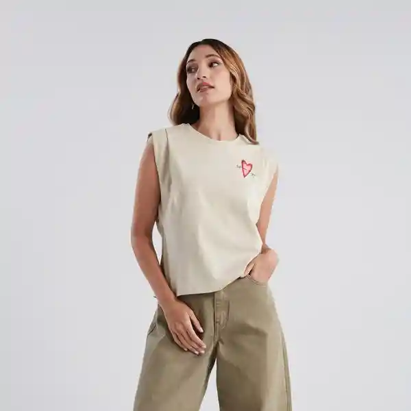 Camiseta sin mangas, color arena, presenta un corte recto con un clásico cuello redondo. Diseño estructurado en los hombros con detalle de pliegues y un estampado gráfico distintivo en la parte frontal. Composición: Confeccionada en 100% algodón, proporcionando una sensación suave y cómoda al contacto con la piel. Ocasiones de uso: Ideal para un look casual o urbano, perfecta para combinar con pantalones o faldas y crear un estilo moderno y original.