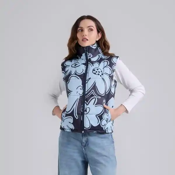 Chaleco estampado azul acolchado de silueta amplia. Cuenta con cuello alto, bolsillos de ribete diagonales en el delantero y un bolsillo interno de ribete. Composición: 100% poliéster. La modelo mide 1,70 m y usa talla S. Cuidados especiales: Leer la etiqueta de cuidados antes de lavar. .