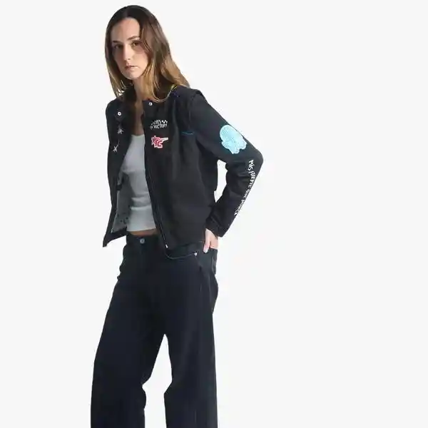 Chaqueta Race - Negro: Chaqueta de estilo racing que presenta un diseño vanguardista con un cuello nerú y manga larga, complementada con una pieza sobrepuesta en el hombro. Moderno sistema de cierre con cremallera. Incluye serigrafía en el frente, parte posterior y mangas para un toque distintivo. Composición: Confeccionada en 100% algodón. Forro y sesgo elaborados en 100% poliéster, garantizando comodidad y durabilidad. Ocasiones de uso: Ideal para lograr una apariencia moderna y audaz, perfecta para complementar cualquier atuendo casual o agregar un toque de estilo a una salida nocturna.