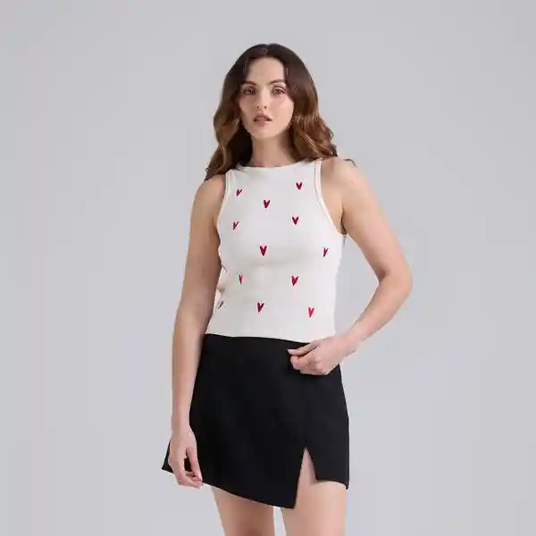 Top marfil de cuello redondo y manga sisa con arte bordado en el delantero. Composición: 63.7% poliéster, 34.3% algodón, 2% elastano. La modelo mide 1,70 m y usa talla M. Cuidados especiales: Leer la etiqueta de cuidados antes de lavar. .