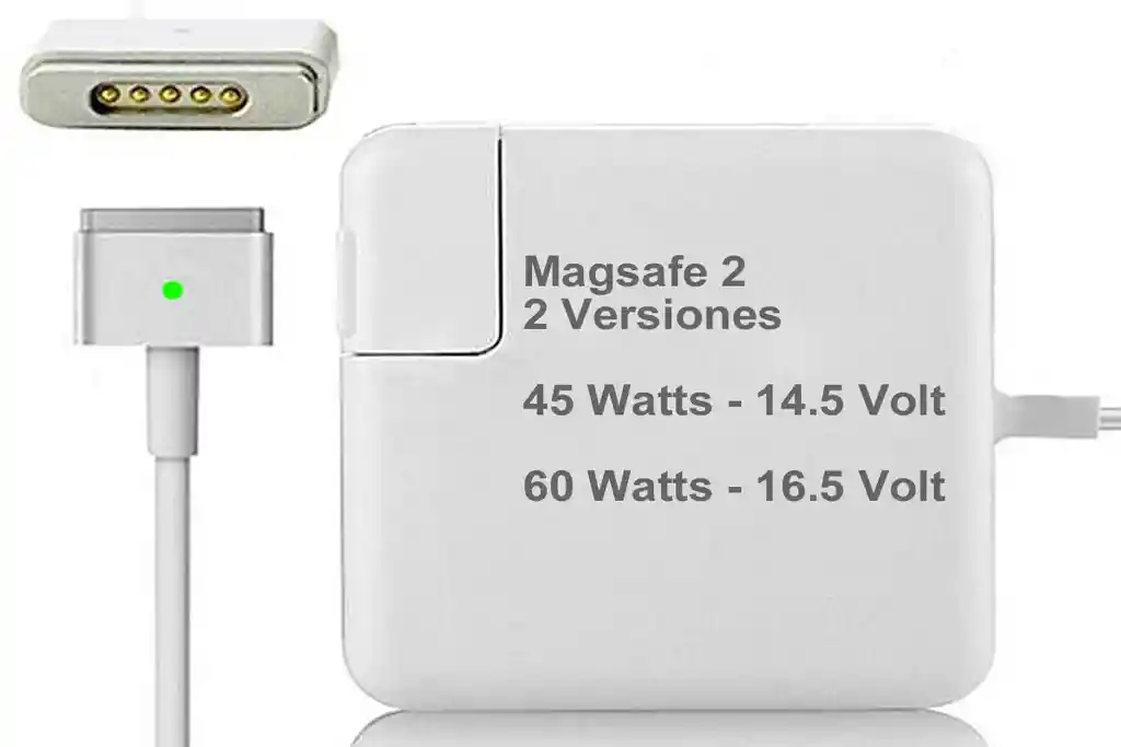 Cargador para computador portátil AirBook y MacBook, 14,5 Voltios/ 3,1 Amperios/ 45 Watts, punta de conexión Magsafe 2 (5 pines). Maneja 120 días de garantía técnica (No cubre daños físicos, descargas eléctricas o humedad). Versión genérica homologada.