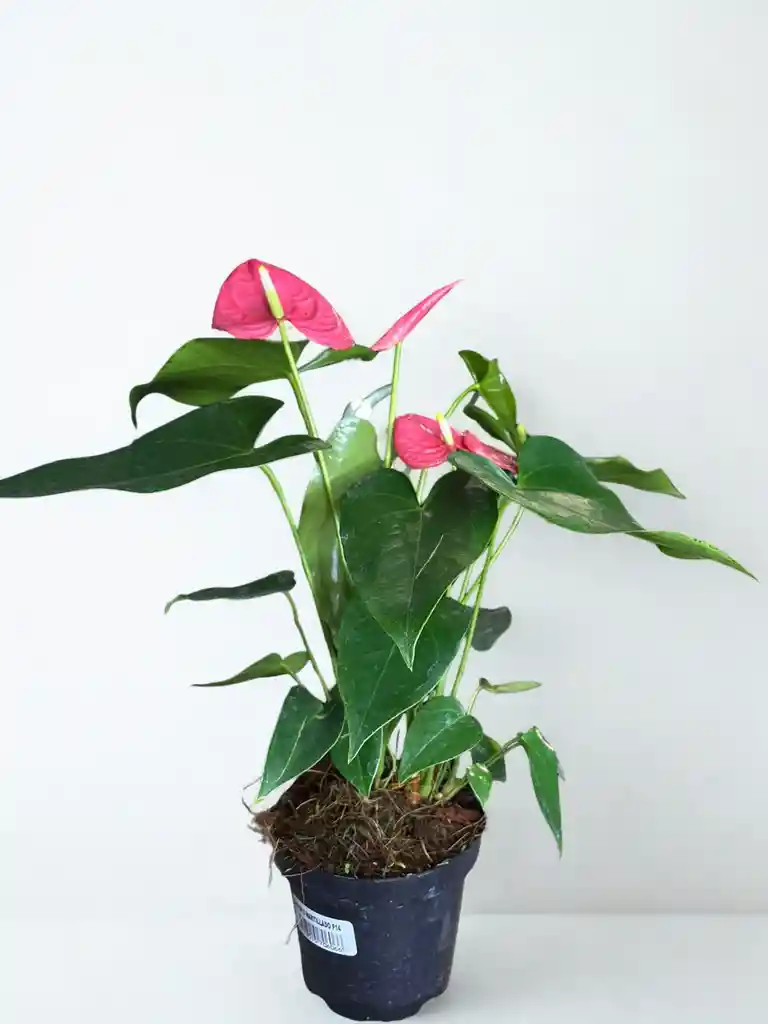 Hermoso anturio rosado en matera negra, con hojas verdes brillantes y flores que aportan un toque elegante y natural al espacio.