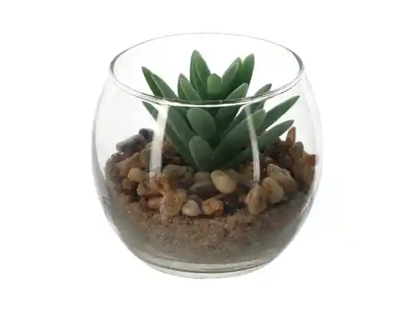 Con Cactus Artificial y Piedras Decorativas. Tiene un Diámetro de 8 x 8 cm.