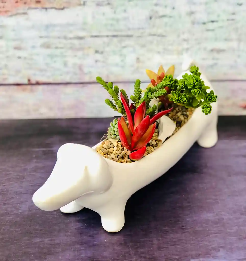 Descripción: Maceta de cerámica esmaltada. en forma de perro salchicha Tamaño: alto: 8.5cm Ancho: 7cm Largo: 27.5cmSe puede agregar: 7 Suculenta tamaño p6 (4.5cm a 6cm de diámetro) de especie variadaVariable: No incluye elementos ambientales de la foto.