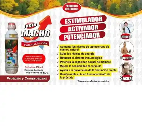 Macho Jarabe X 2 Unidades - Unidad Alimento a base de maltodextrina con malta, chontaduro, borojò, enriquecido con vitaminas A, E, B1, B2, Niacina, minerales, hierro y zinc. Sensación de juventud y energía. Su fórmula a base de malta actúa como un alimento nutritivo por lo que decimos que ejerce una acción “combustible” para los músculos y cerebro. Podríamos atribuirles los siguientes beneficios: Mejora la autoestima y seguridad; estimula y prolonga el placer; y mejoramiento general de la resistencia física. Se recomienda consumir según porción dosificadora una vez al dìa en la mañana o en la noche. No tiene contraindicaciones. Jarabe 500 ml