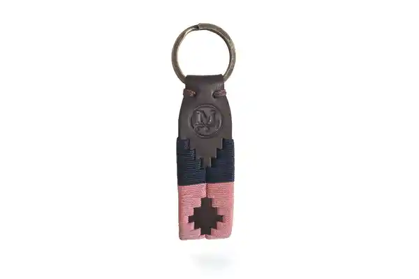 De Cuero Café Oscuro Con Tejido Azul Oscuro y Rosado.
