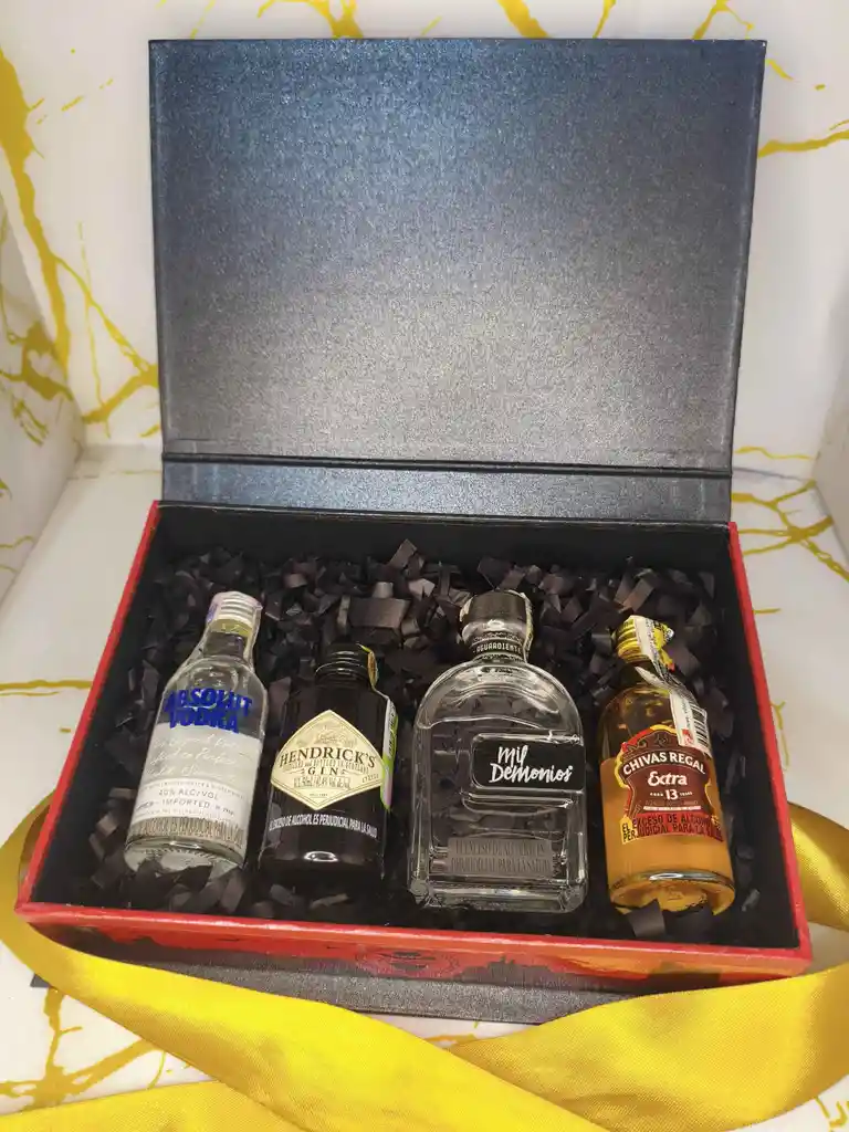 Eleva tus regalos al siguiente nivel con este set de mini licores en un estuche premium que combina elegancia y portabilidad. Ideal para cualquier ocasión: el detalle que todos recordarán. Y para que tu regalo sea 100% tuyo, tienes la opción de solicitar una tarjeta personalizada con foto y mensaje. Simplemente coordínalo por mensaje interno al confirmar tu compra. Contiene: Vodka Absolut 50 ml Whisky Chivas Regal Extra 13 Años 50 ml Ginebra Hendricks 50 ml Aguardiente Mil Demonios 50 ml