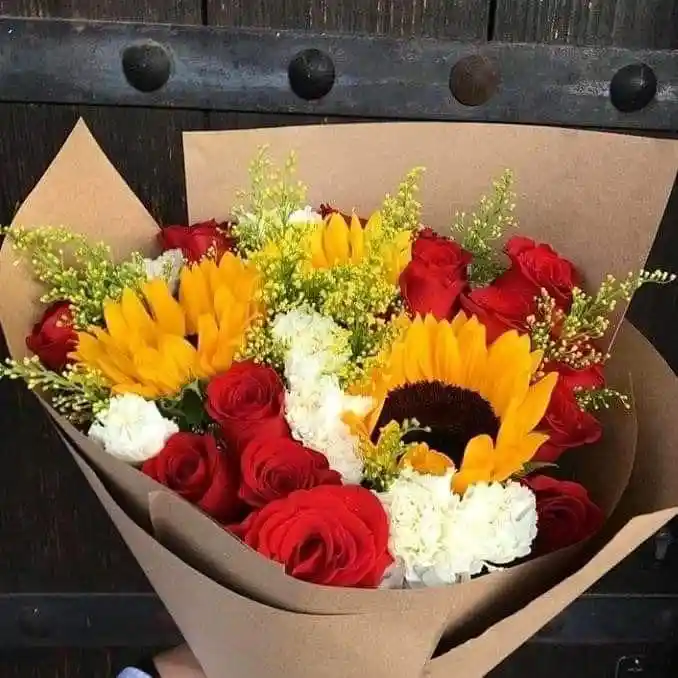 Hermoso ramillete tamaño grande realizado con lirios, rosas, claveles y flores de complento en tonos cálidos. Envuelto en papel perlado importado, una opción muy elegante.