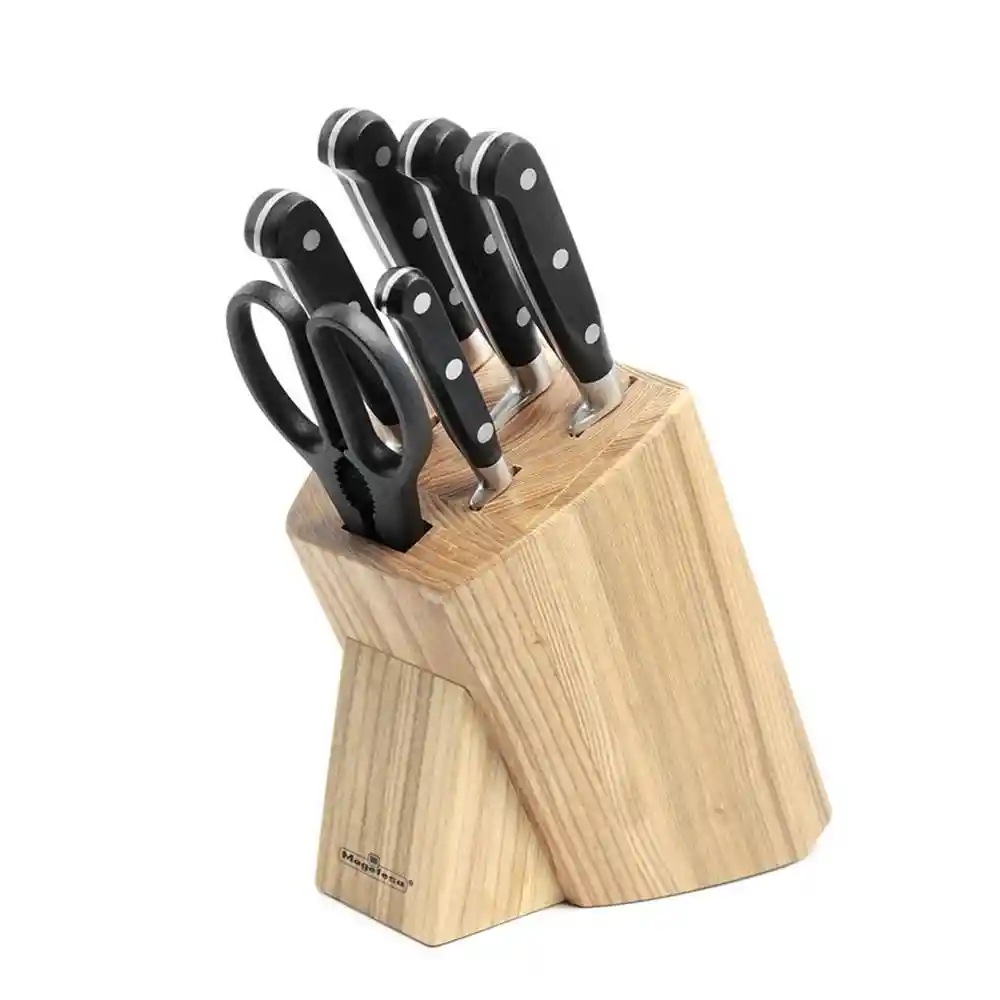 Composición: Magefesa Cuchillo Mondador 100 mm 1 Und + Magefesa Cuchillo Deshuesador 125 mm 1 Und + Magefesa Cuchillo Panero 200 mm 1 Und + Magefesa Cuchillo Trinchante 150 mm 1 Und + Magefesa Cuchillo Cocinero 200 mm 1 Und + Magefesa Tijera 1 Und. Elaborado en Acero Inoxidable Forjado Que Asegura Resistencia y Durabilidad Hoja de Una Sola Pieza Dureza Superior Hrc 55 + / - 2 Que Garantiza un Filo Prolongado Mango Abs de Alta Resistencia Garantía Limitada de Por Vida no Incluye Elementos de Ambientación Base en Madera Que Cuida el Filo de Los Cuchillos