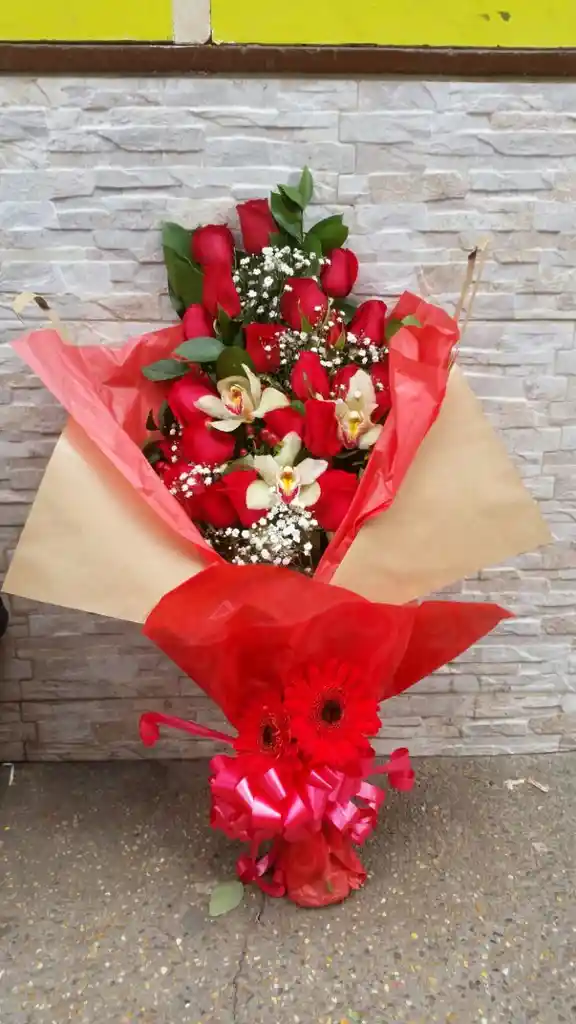 Bouquet de 18 rosas 3 orquideas 2 gerberas