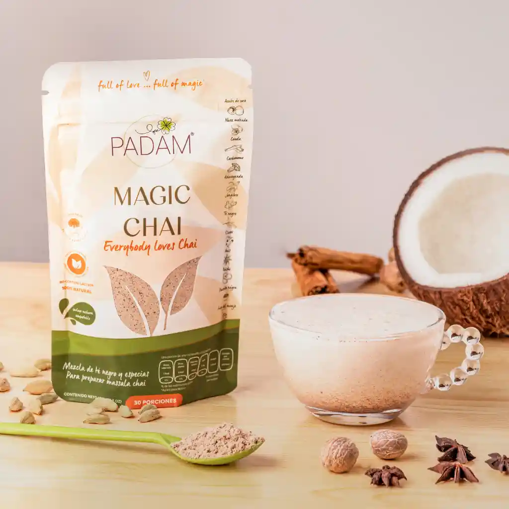 El Magic Chai de PADAM es una mezcla sinérgica de 8 especias y 4 superalimentos (incluidos 2 adaptógenos) para preparar la deliciosa y famosa receta de la India: El MASALA CHAI. Está combinación está diseñada para reconfortarte y darle un “Boost” a tu sistema inmunológico, entre muchos otros beneficios. Hemos incluido en nuestro CHAI ingredientes ADAPTÓGENOS como el REISHI (Ganoderma Lucidum) y la ASHWAGANDA; los Adaptógenos son sustancias que te ayudarán a responder mejor ante el estrés y muchos de los desafíos físicos y mentales actuales. 100 gr. Beneficios: ✦ Fortalece y potencia el sistema inmune. ✦ Mejora nuestra capacidad de respuesta ante el estrés. ✦ Fortalece el cuerpo y la mente ante los desafíos físicos, ambientales y emocionales. ✦ Tiene la capacidad de regular y devolver el balance a diferentes funciones fisiológicas. ✦ Disminuye el cortisol y regula el sistema NeuroEndocrino. ✦ Mejora el desempeño cognitivo, relaja el cuerpo, y mejora el estado de animo. ✦ Antiinflamatorio, antioxidante y potente digestivo.