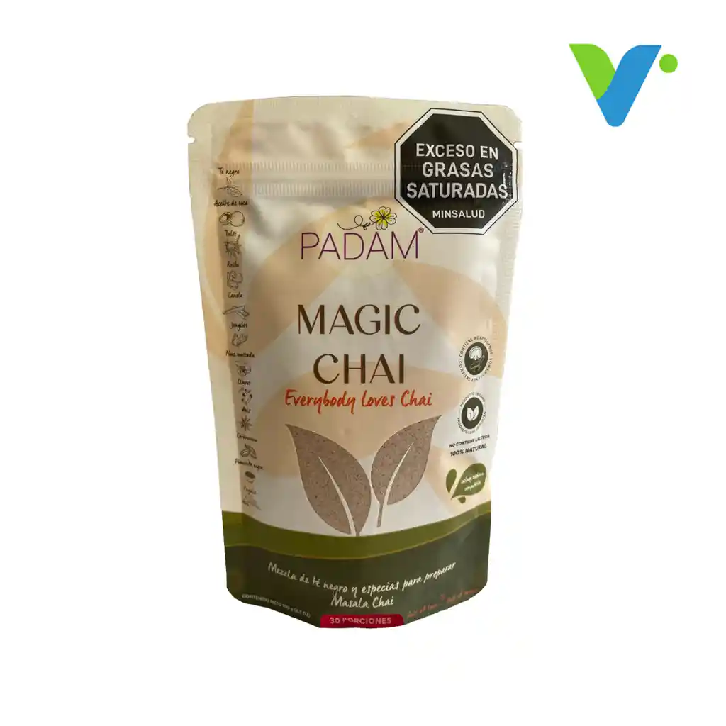 Ingredientes: Aceite de coco en polvo, nuez moscada en polvo, canela en polvo, cardamomo en polvo, ashwagandha, reishi, jengibre en polvo, hojas de té negro en polvo, clavos de olor en polvo, anís en polvo, mok fruit, pimienta negra en polvo. Magic chai Padam es una mezcla sinérgica de 8 especias y 4 súper alimentos para preparar una deliciosa y famosa bebida de la India, el Massala. Incluye 2 adaptógenos: el Reishi (Ganoderma Lucidum) y la Ashwagandha, poderosas plantas con la capacidad de potenciar el sistema inmune. Beneficios: Mejora el sistema inmune. Ayuda a regular el estrés. Aporta energía. Regula el sistema neuro inmune. 100% natural. Apta para veganos. libre de azúcar.