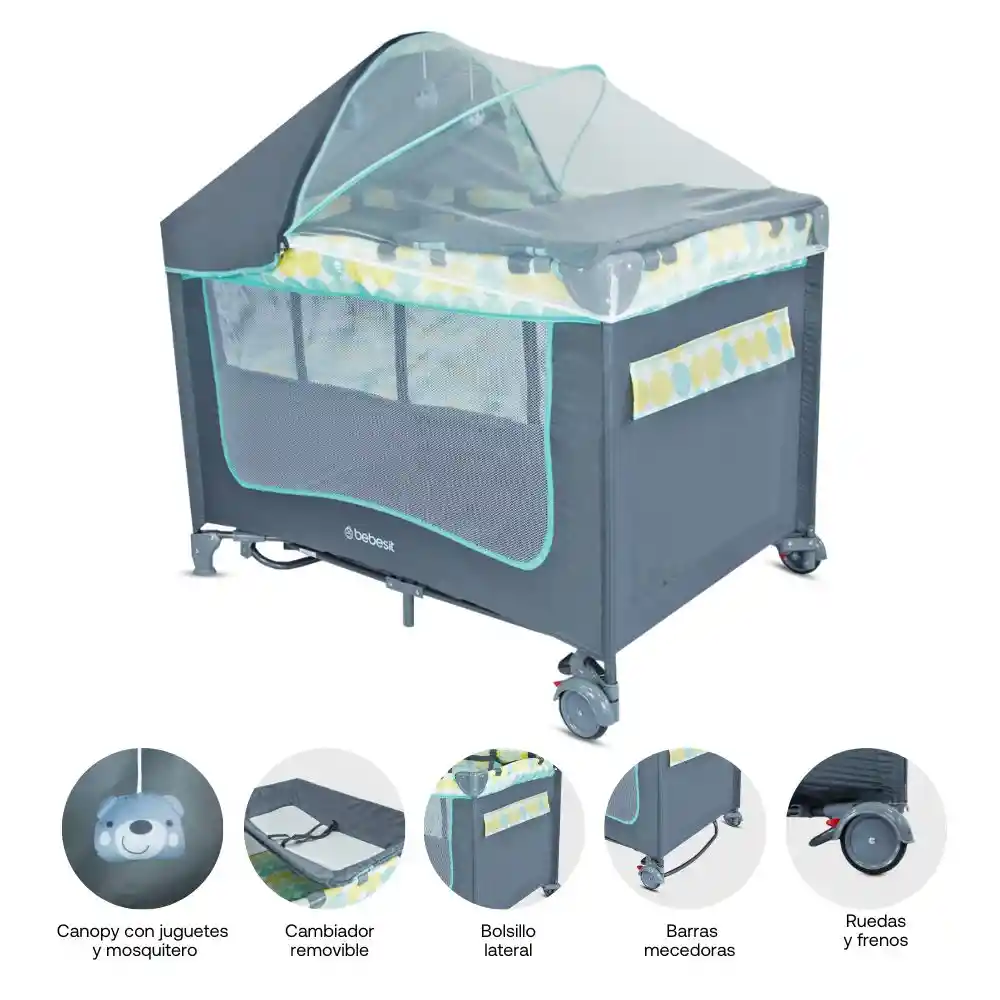Dos Niveles de Altura - Canopy Con Mosquitero - Incluye Juguetes en el Canopy - Cambiador Incluido - Con Bolsa de Transporte - Función de Mecedora - Bolsillo Lateral de Almacenamiento - Ruedas Con Freno Incluidos - Fácil de Armar y Desarmar.