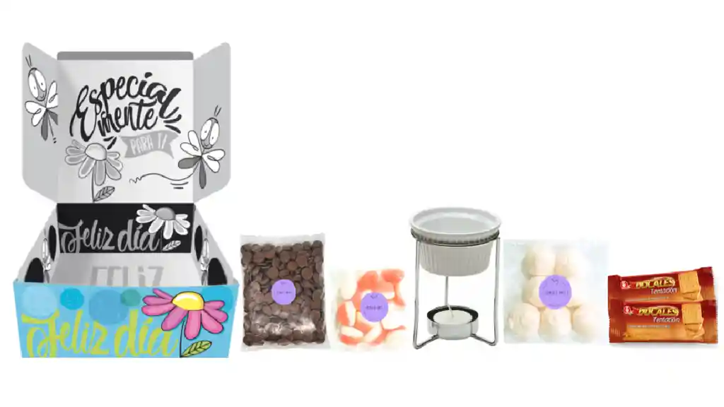 Comparte un gran momento con este regalo! Contiene: - Base ceramica para fondue con vela - Chocolate para derretir - Bolsa de gomitas - Bolsa de masmelos - 2 Paquetes de galletas Tentación - Caja con mensaje epecial de acuerdo al motivo del regalo