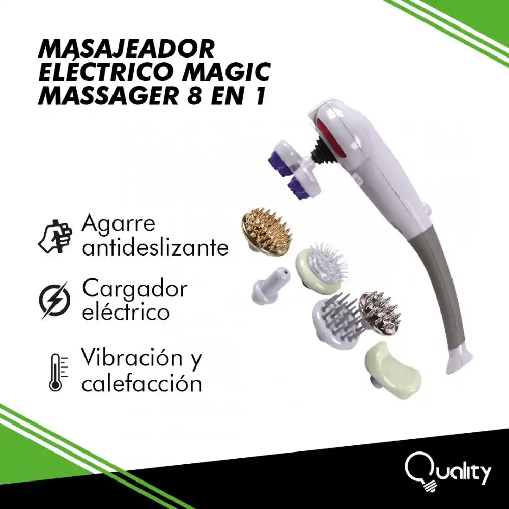 Proporciona un cuidado especial para cada una de sus partes del cuerpo. Para que vivas y sientas los masajes más profundos en cada parte del cuerpo, así como increíbles sensaciones a la hora de masajear tu piel. Elimina la fatiga y el estrés, mientras se realiza presión sobre ciertos puntos en los músculos y mejora la circulación sanguínea hasta que se sienta como nuevo y en forma. Características: • Cargador eléctrico. • Equipado con 7 cabezales de masaje diferente. • Agarre antideslizante. • Se puede usar en cualquier lugar. • Equipado con función de vibración y calefacción. • Tan fácil de manejar y cómodo de usar. • Liviano. • Elimina la necesidad de masaje manual. • Apto para personas jóvenes y adultas.