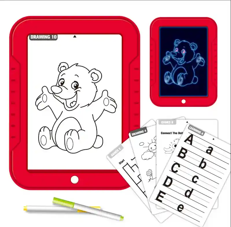 Tableta o tablero de dibujo MagicPad para pintar con luz y marcadores - Explota toda la creatividad de tus hijos con MagicPad, una tableta de dibujo que les garantizará muchas horas de diversión y aprendizaje. - MagicPad trae también 30 hojas de trabajo dividas en tres temas: learning (aprendiendo) con ejercicios básicos de escritura y matemáticas drawing (dibujando) con guías para dibujar animales y objetos y games (juegos) con divertidas actividades para desarrollar. - ¡MagicPad alumbra! Oprime el botón y el marco de la tableta se iluminará con ocho diferentes colores. Caracteristicas: * Material: de plástico * Color: Roja * Paquete: Caja de color * Función: luz LED, imágenes en color * Edad aplicable: Niños (4-6 años) ¡No te quedes sin la tuya!
