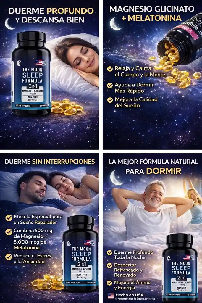 La combinación de magnesio glicinato y melatonina es popular para: - Mejorar la calidad del sueño - Reducir el estrés y ansiedad antes de dormir - Promover la relajación muscular