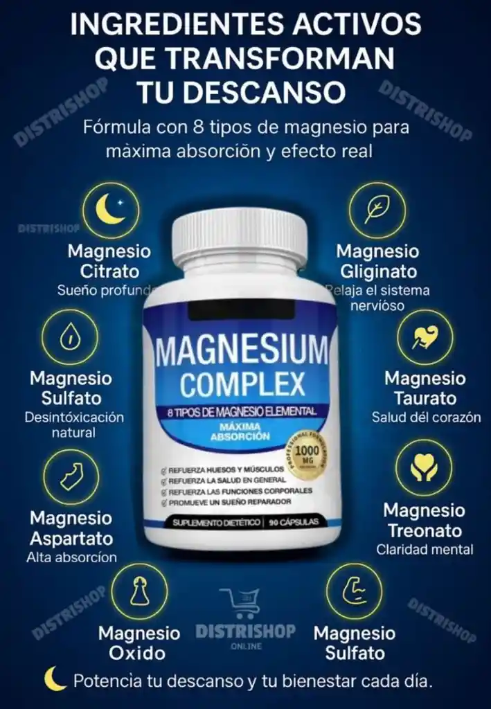 El magnesio complex es un suplemento esencial para el cuerpo. Ayuda con: - Relajar los músculos y reducir el estrés - Regular el ritmo cardíaco y la presión arterial - Mejorar la calidad del sueño - Apoyar la función nerviosa y muscular