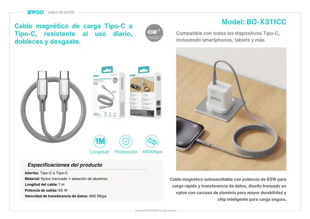 Cable magnético de alta resistencia Velocidad de Carga : 65W Puerto de carga : Typo C - Typo C Medidas : 1MT