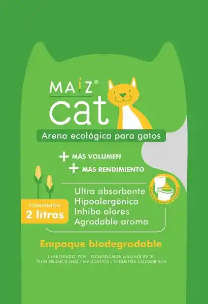 Maíz Cat - Arena ECOlógica para gatos Producto altamente absorbente, al contacto con heces y/o orina de gatos elimina el mal olor y la humedad. -BENEFICIOS- Inhibe olores Aglomerante Absorbente Agradable aroma Biodegradable Se puede verter al sanitario Bajo contenido de polvo -INSTRUCCIONES DE USO- *Agregar Maíz Cat a la caja sanitaria hasta alcanzar 4cm de altura. *Retirar las aglomeraciones de heces y/o orina al menos una vez al día con la pala recolectora. *¿Cómo desechar?: Dentro de la bolsa de residuos orgánicos o por el sanitario. *¿Cómo tirar los desechos al sanitario?: Esperar de 5 a 10 minutos y luego baje el agua. NO tapa las tuberías. *¿Primera vez?: Agregar una ligera capa de la cama de arena anterior sobre el Maíz Cat.