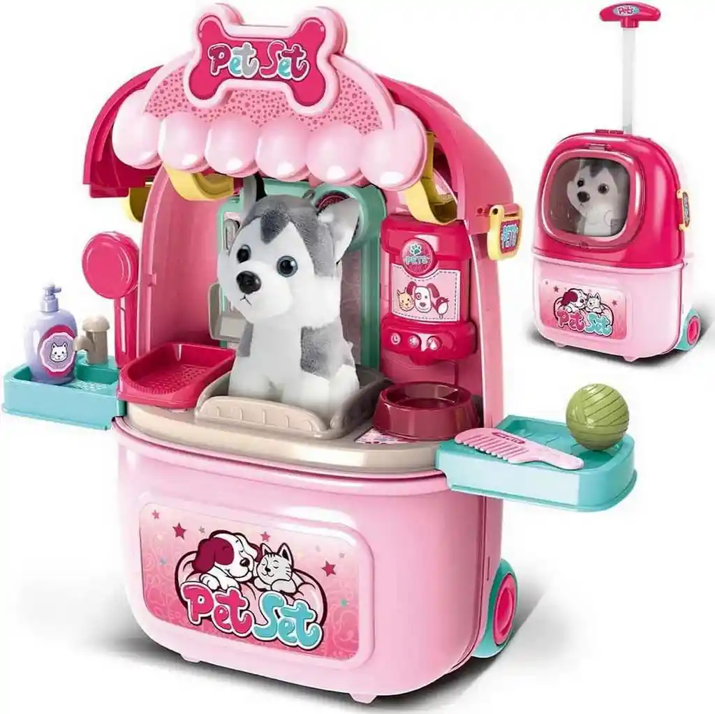 Divertido set de juego 2 en 1 tipo maleta con diseño de carrito de mascotas, que incluye un adorable perrito de peluche y múltiples accesorios para su cuidado, como cepillo, tijeras, plato, comida, pelota y más, permitiendo a las niñas recrear actividades de baño, alimentación y peinado. Su práctica estructura con ruedas y asa extensible facilita transportarlo a cualquier lugar, transformándose fácilmente en una estación de cuidado de mascotas para fomentar la imaginación, el juego de roles y la creatividad en un entorno seguro y entretenido. Ficha Técnica: Material : Plástico ABS , No toxico Edad Apto + 3 años Dimensiones . 43.3 cm x 23 cm x 46 cm Certificado de conformidad: E5-0359-2021 Referencia: 008-980A-3 ** _Para defectos de fábrica o retractos: \_Por favor revise el producto apenas lo reciba y antes de usarlo. No aplican ley de retracto o defectos de fábrica luego de usar el producto. Se manejan máximo 5 días para reportar defectos de fábrica (por ejemplo, producto funciona mal, piezas faltantes, rotas, etc). Para hacer efectiva la devolución el producto debe devolverse con el empaque original, el cual debe estar en buen estado, incluir todos los documentos y las partes completas y sin daños.