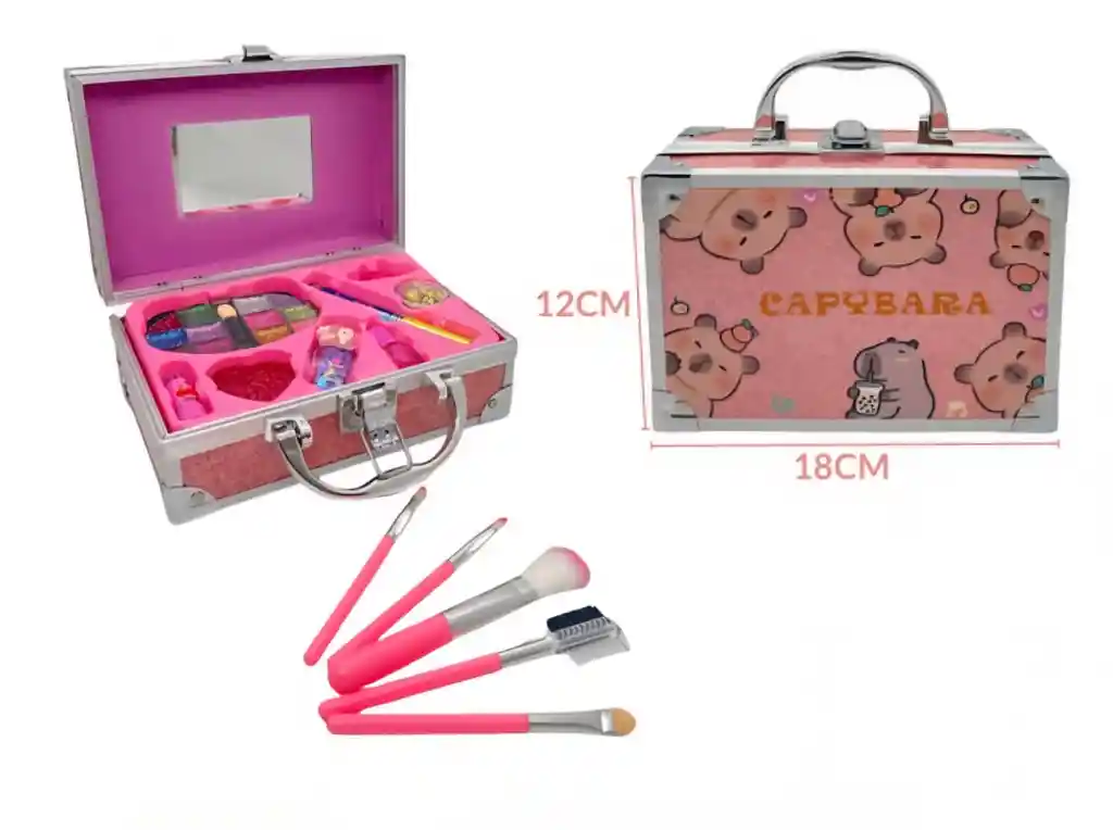 Este adorable set de maquillaje infantil está inspirado en una tierna capibara y es perfecto para que las niñas y niños jueguen, imaginen y se diviertan con total seguridad. Incluye sombras, labiales y accesorios suaves para la piel, completamente lavables, ideales para uso diario sin riesgos. El estuche viene con un espejo integrado en forma de capibara, con colores vibrantes y detalles encantadores que harán que cada juego de maquillaje sea una experiencia mágica. Su diseño portátil y resistente permite llevarlo a cualquier lugar: la casa de los abuelos, viajes, o simplemente para compartir con amigos.