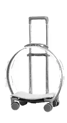 Transportadora premium para mascotas pequeñas, con diseño circular tipo cápsula, estructura transparente, ruedas giratorias y manija extensible. Ideal para viajes, paseos o visitas al veterinario. Cómoda, ventilada y segura.