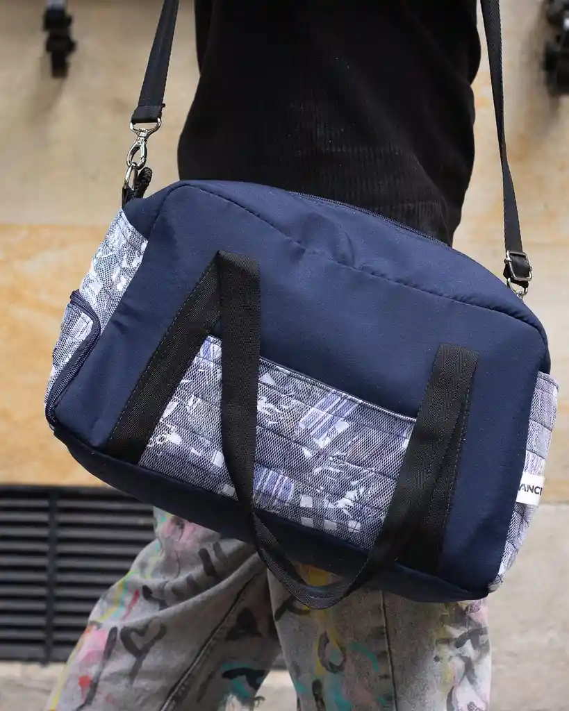 Bolso deportivo creado con tela residual, bolsillos creados a través de la unión de retazos (Proceso Sostenible). 1 bolsillo frontal, 1 bolsillo zapatero, 1 bolsillo lateral, 1 espacio interno para termo o botella, 1 bolsillo interno de maya, espacio principal con 2 tiras para colgar y 1 tira graduable. Medidas: Alto 23cm, Ancho 38 cm, Base 20 cm.
