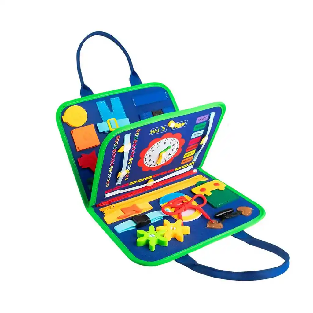 Despierta la curiosidad y el ingenio de tu pequeño con nuestro increíble tablero de actividades portátil, ¡la solución perfecta para el aprendizaje y el entretenimiento en cualquier lugar! Diseñado como un práctico maletín de fieltro, este juguete todo-en-uno se despliega para revelar un mundo de desafíos que desarrollan habilidades motoras finas y cognitivas, incluyendo hebillas, cremalleras, cordones para atar, engranajes giratorios y un reloj para aprender la hora. Además, la diversión se extiende a su exterior, con vibrantes diseños del abecedario por un lado y un emocionante mundo de dinosaurios por el otro. Es el compañero de viaje ideal para mantener las manitas ocupadas y las mentes activas lejos de las pantallas, convirtiendo cada momento en una valiosa oportunidad de juego y desarrollo. Ficha Técnica: Material: Plástico ABS Dimensiones : 28 cm x 24 cm Apto para bebes + 3 Años Certificado de conformidad: E5-0359-2021 Referencia: DM1315 ** _Para defectos de fábrica o retractos: \_Por favor revise el producto apenas lo reciba y antes de usarlo. No aplican ley de retracto o defectos de fábrica luego de usar el producto. Se manejan máximo 5 días para reportar defectos de fábrica (por ejemplo, producto funciona mal, piezas faltantes, rotas, etc). Para hacer efectiva la devolución el producto debe devolverse con el empaque original, el cual debe estar en buen estado, incluir todos los documentos y las partes completas y sin daños.