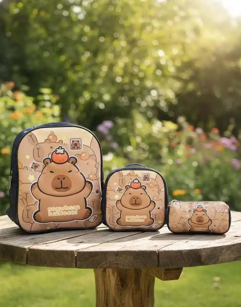 🎒🐻 Set Infantil Capibara – Mochila + Lonchera + Cartuchera 🐻🎒 ✨ Encantador set infantil con diseño de capibara , ideal para niños y niñas que aman los personajes dulces y colores suaves 🤎🌟. Incluye mochila, lonchera y cartuchera, perfectamente combinadas. 🎒 Mochila: tamaño ideal para el colegio, cómoda y liviana 📚 🥪 Lonchera: práctica para llevar la merienda diaria 🍪🧃 ✏️ Cartuchera: perfecta para lápices, colores y útiles escolares 🖍️✂️ 🌈 Colores cálidos y diseño adorable que enamora a primera vista 🧵 Material resistente, fácil de limpiar y duradero 🎁 Ideal para colegio, salidas o como regalo especial 💖 Tierno • 💖 Funcional • 💖 Combinado perfecto