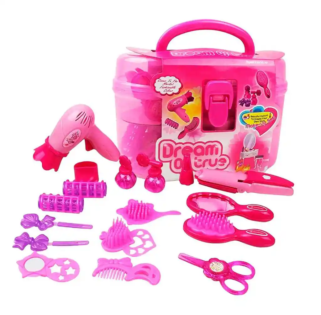 El set de juguetes de peluquería Dream of True viene en una práctica maleta plástica y contiene accesorios como secador, plancha, peines, tijeras, espejo y broches, ofreciendo a las niñas mayores de 3 años la oportunidad de recrear un auténtico salón de belleza; un juego completo que estimula la imaginación, la creatividad y el juego de roles mientras se divierten peinando, creando estilos y compartiendo momentos con amigos o familiares. Ficha Tècnica: Dimensiones: 19 cm x 13 cm x 10 cm Material : Plástico ABS no toxico Edad recomendada: + 3 años Certificado de conformidad: SL-CS-210044 Referencia: 1212AB Términos de Garantía: Para defectos de fábrica o retractos: Por favor revise el producto apenas lo reciba y antes de usarlo. No aplican ley de retracto o defectos de fábrica luego de usar el producto. Se manejan máximo 5 días para reportar defectos de fábrica (por ejemplo, producto funciona mal, piezas faltantes, rotas, etc).