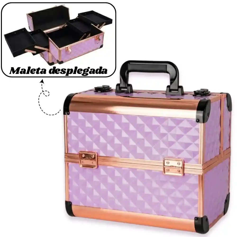 Maleta Organizador De Maquillaje Cosmetiquera Neceser 4 Bandejas Morada Oro Rosa. Presentamos el Neceser-Cosmetiquera de Maquillaje definitivo, el organizador de 4 Bandejas plegables en un impresionante acabado Morado/lila Diamante y Rose Gold, diseñado para el estilista moderno y la fashionista que exige lo mejor. Características: - Organización total: Despliega todo tu arsenal con facilidad. Como se muestra en la imagen de referencia, su ingenioso sistema cantilever de 4 bandejas escalonadas (2 de cada lado) se expande para darte una visión clara y un acceso instantáneo a todas tus herramientas, paletas y brochas. - Capacidad Amplia de 4 Niveles: Sistema de bandejas para tus cosméticos más pequeños y un compartimento base profundo para paletas grandes, botellas, brochas y mucho más. - Seguridad Total: Equipado con cierres dobles con llave para mantener tus valiosos productos seguros. - Portabilidad Robusta: Mango de transporte negro ergonómico y resistente para llevarlo cómodamente a cualquier lugar. - Durabilidad Reforzada: Esquinas reforzadas de metal negro y perfiles de aluminio para mayor durabilidad y protección. Especificaciones: - Número de Bandejas: 4 (sistema de 2 de cada lado). - Cerraduras: 2 (con llave). - Color: Morado/lila Texturizado / Rose Gold / Negro. - Revestimiento Interior: Negro texturizado. Nota: Las imágenes publicadas son de referencia, el producto real puede presentar ligeras variaciones en su diseño y tonalidad de color.