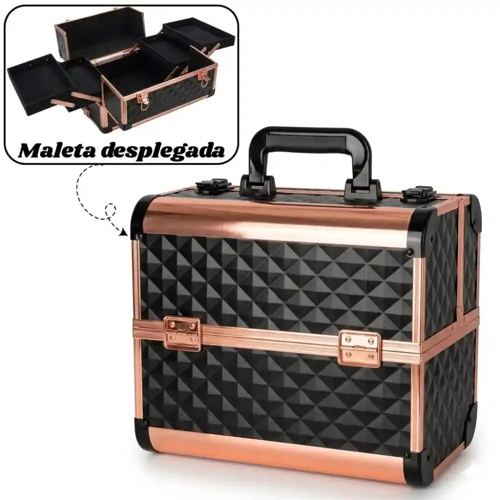 Maleta Organizador De Maquillaje Cosmetiquera Neceser 4 Bandejas Negra Oro Rosa. Presentamos el Neceser-Cosmetiquera de Maquillaje definitivo, el organizador de 4 Bandejas plegables en un impresionante acabado Oro Rosa Diamante, diseñado para el estilista moderno y la fashionista que exige lo mejor. Características: - Organización total: Despliega todo tu arsenal con facilidad. Como se muestra en la imagen de referencia, su ingenioso sistema cantilever de 4 bandejas escalonadas (2 de cada lado) se expande para darte una visión clara y un acceso instantáneo a todas tus herramientas, paletas y brochas. - Capacidad Amplia de 4 Niveles: Sistema de bandejas para tus cosméticos más pequeños y un compartimento base profundo para paletas grandes, botellas, brochas y mucho más. - Seguridad Total: Equipado con cierres dobles con llave para mantener tus valiosos productos seguros. - Portabilidad Robusta: Mango de transporte negro ergonómico y resistente para llevarlo cómodamente a cualquier lugar. - Durabilidad Reforzada: Esquinas reforzadas de metal negro y perfiles de aluminio para mayor durabilidad y protección. Especificaciones: - Número de Bandejas: 4 (sistema de 2 de cada lado). - Cerraduras: 2 (con llave). - Color: Negro Texturizado / Oro Rosa. - Revestimiento Interior: Negro texturizado. Nota: Las imágenes publicadas son de referencia, el producto real puede presentar ligeras variaciones en su diseño y tonalidad de color.
