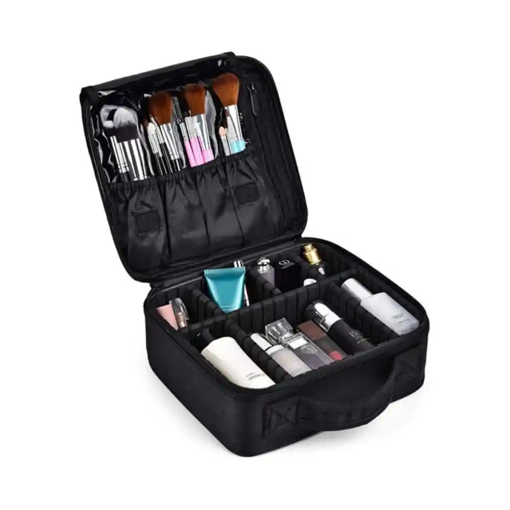 Maleta organizadora, con cierre interno y espacio para brochas. Espacios intercambiables. Material sintético, medidas: 10 cm x 25 cm x 23 cm (un cierre), aproximadamente.