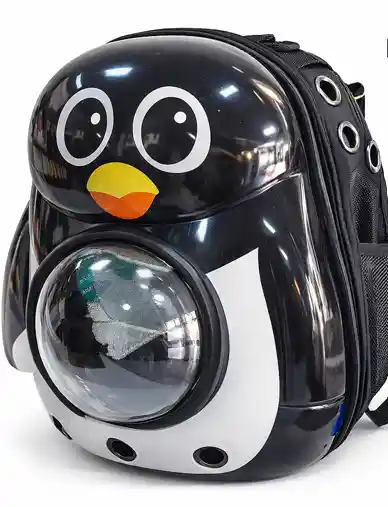 La maleta o morral cápsula estilo "pinguino" es un transportador moderno y rígido para mascotas pequeñas (gatos/perros, máx. 8-9 kg), diseñado para viajes y senderismo. Cuenta con una ventana frontal transparente ("ojo de buey") para vista panorámica, ventilación superior/lateral, estructura ergonómica para la espalda, y materiales resistentes al agua