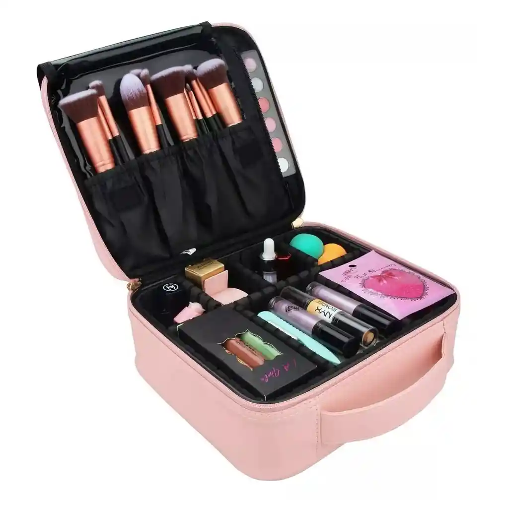 El maletín de maquillaje es una cosmetiquera rosa de alta calidad, fabricada en piel sintética duradera y fácil de limpiar, con cremalleras resistentes para mayor seguridad. Cuenta con compartimentos ajustables y ranuras especiales para brochas, permitiendo organizar y proteger tus herramientas de maquillaje. Su diseño portátil y ligero, con asa ancha, facilita su transporte, siendo ideal para viajes o almacenamiento en casa. Además de cosméticos, puede usarse para guardar joyas, accesorios electrónicos, aceites esenciales, artículos de tocador y más, ofreciendo versatilidad y practicidad en un solo estuche. Ficha Técnica: Dimensiones: 26 cm x 23 cm x 9 cm Material: ABS - Poliester Uso: Cosméticos - Viajes - etc Términos de garantía: _Para defectos de fábrica o retractos: _Por favor revise el producto apenas lo reciba y antes de usarlo. No aplican ley de retracto o defectos de fábrica luego de usar el producto. Se manejan máximo 5 días para reportar defectos de fábrica (por ejemplo, piezas faltantes, rotas, etc). Para hacer efectiva la devolución el producto debe devolverse con el empaque original, el cual debe estar en buen estado, incluir todos los documentos y las partes completas y sin daños.